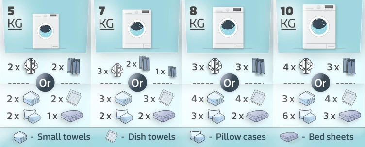 Larger families or homes that wash towels, jeans, and bedding or blankets regularly should consider a 10 kg or larger capacity to avoid overfilling.